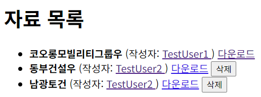 그리고 전에 만든 자료를 삭제하고 싶어서 옆에 삭제 버튼을 만들어서 올렸던 자료를 삭제할 수 있게 만들었어요.